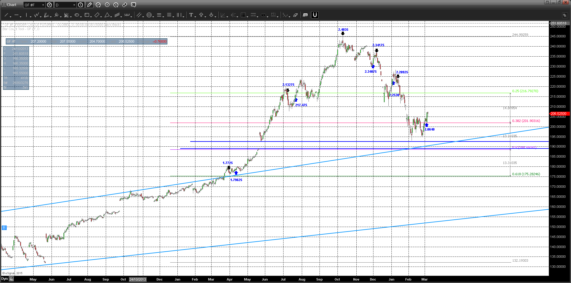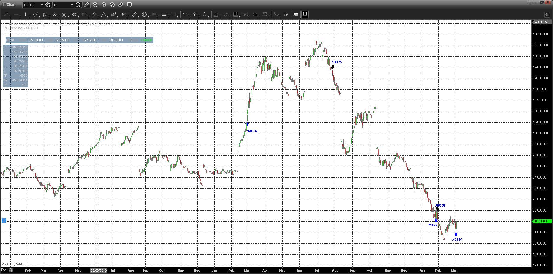 The Continuous Contract chart GF below shows the top of the market Oct 14′ at the 2.40$ level and subsequent roll to the 1.93$ area on the chart. 2 sided trade stabilized the market at the ‘Gap-Area’ 1.90$, intersecting with the near 50% retracement from the May 13′ Extreme Low (1.30$) – Oct 14′ Extreme High (2.40$) and the long term uptrend phase shift line (light blue) traversing through. This area seems to be a logical balance area. Whether the market is ‘ready’ for a retracement rally is in question: contra-seasonal patterns and odds of an intermediate bottom, typically occur in the April time frame, so we may be a bit early and could expect a final move lower into the 1.90$ level for another test. There are other external influences, such as the west-coast port labor disruptions, effecting the off-take, which may force trading partners to look elsewhere for beef short term (ie., China). All that said, the program produces an Average win over 74 trades of .06$/winning trade. The expectancy would take the trade up to the 2.12-2.13. However, the risk is substantial at the sub 1.93 level from here.