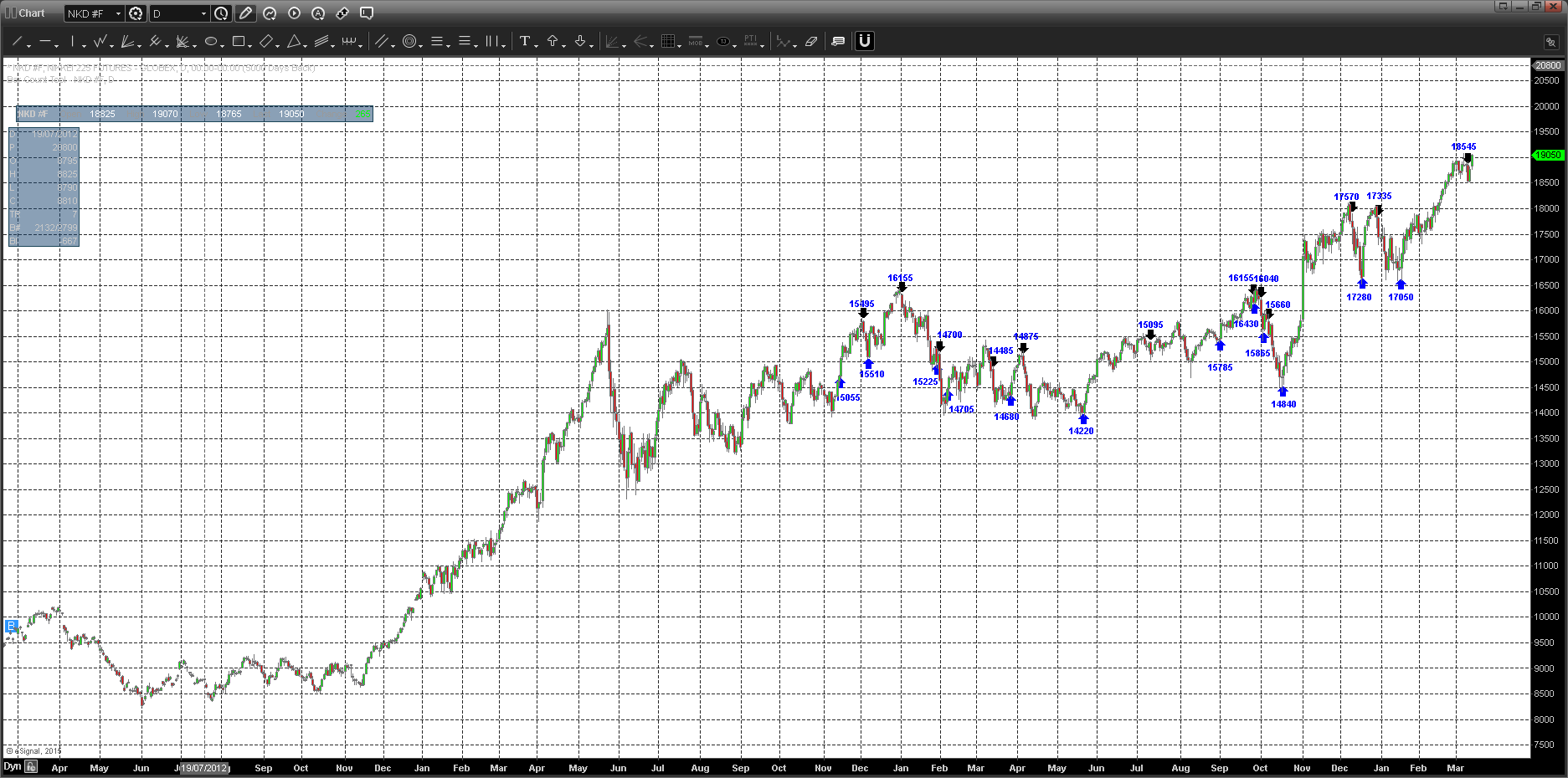 The system picked up a big swing to the upside in the Nikkei 225 Index futures; as per the chart below, last Long entry (1/16/15) at 17,050 produced big profit of 1,495 pts/contract = 7,475$/contract (17,050 – 18545). This last win is 3x Avg Win over 6 years. The exit and reverse to the short side on 3/10/15 (18545) came and went. I was stopped out this morning for a -455 pt/contract loss = -2,275/contract. Which is why you need a system that generate large Win:Loss over long time frame samples so that if the system experiences short-intermediate term draw down, you are buffered by the ‘tail’ event wins.