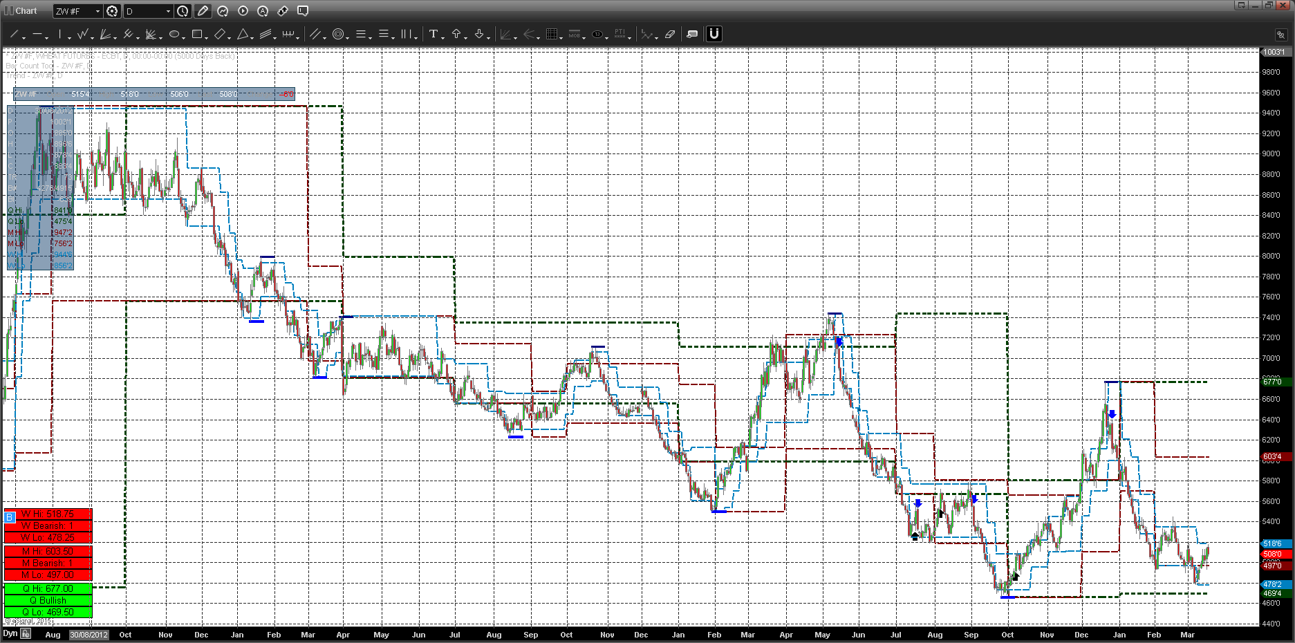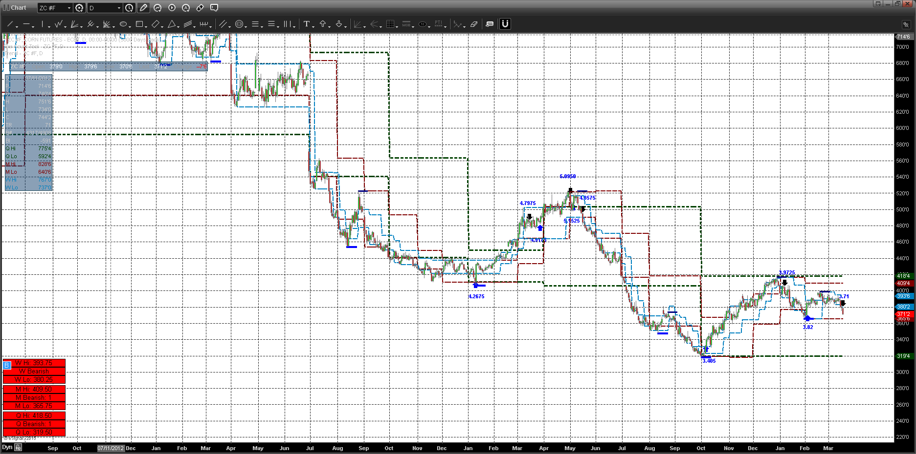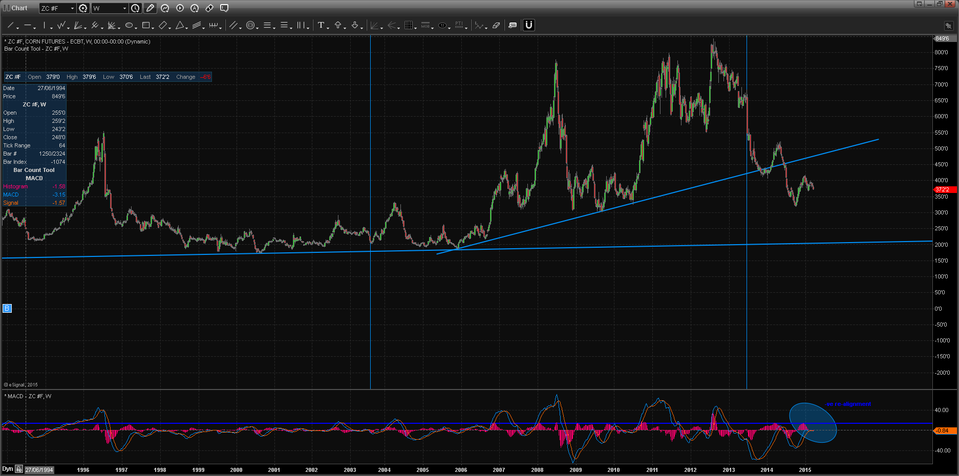 Wheat day chart above, showing the intermediate short position initiated Dec 12/14 at 6.09$, not confirming the most recent long entry in Corn, implying weakness in the Ag space.