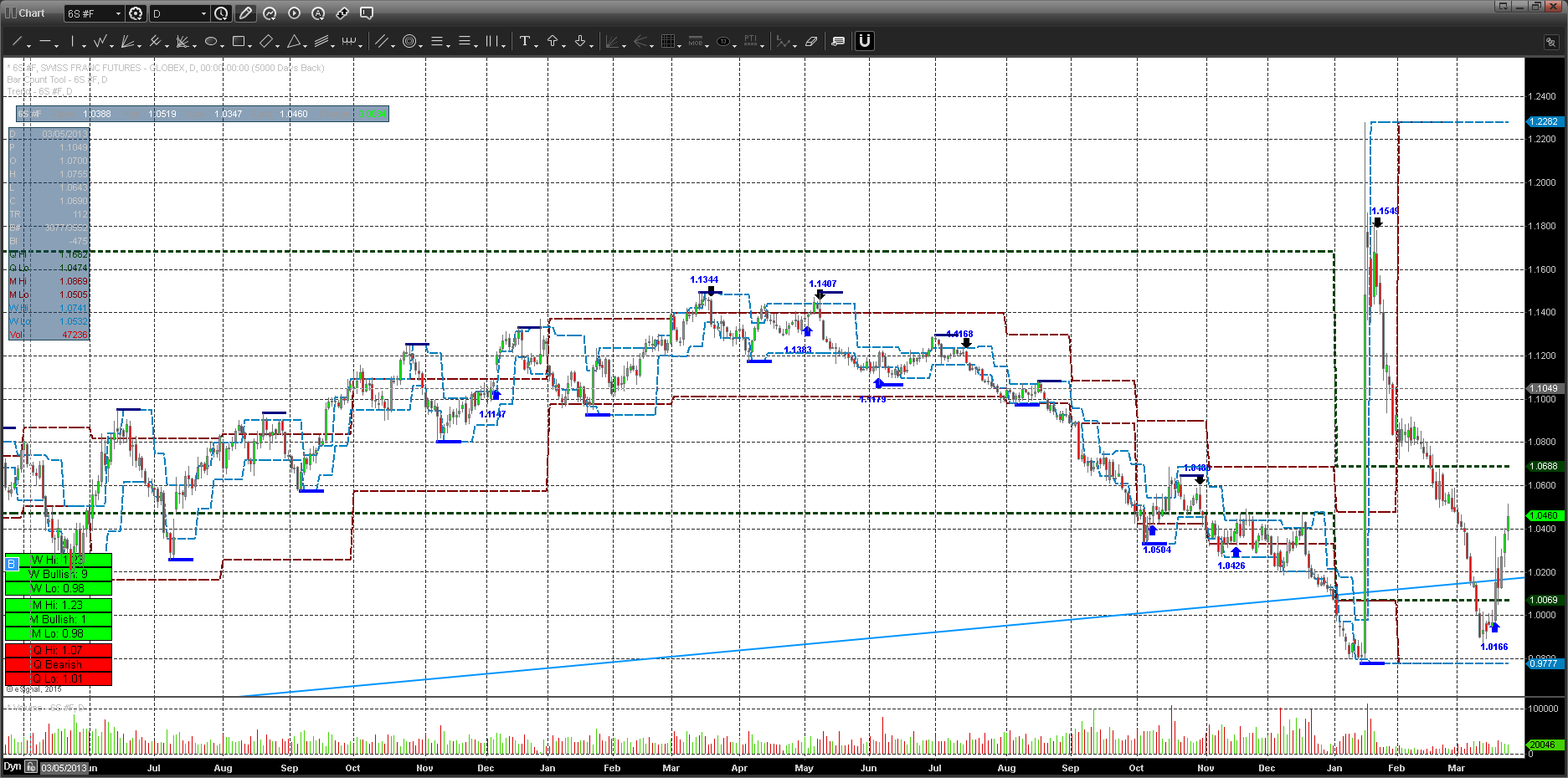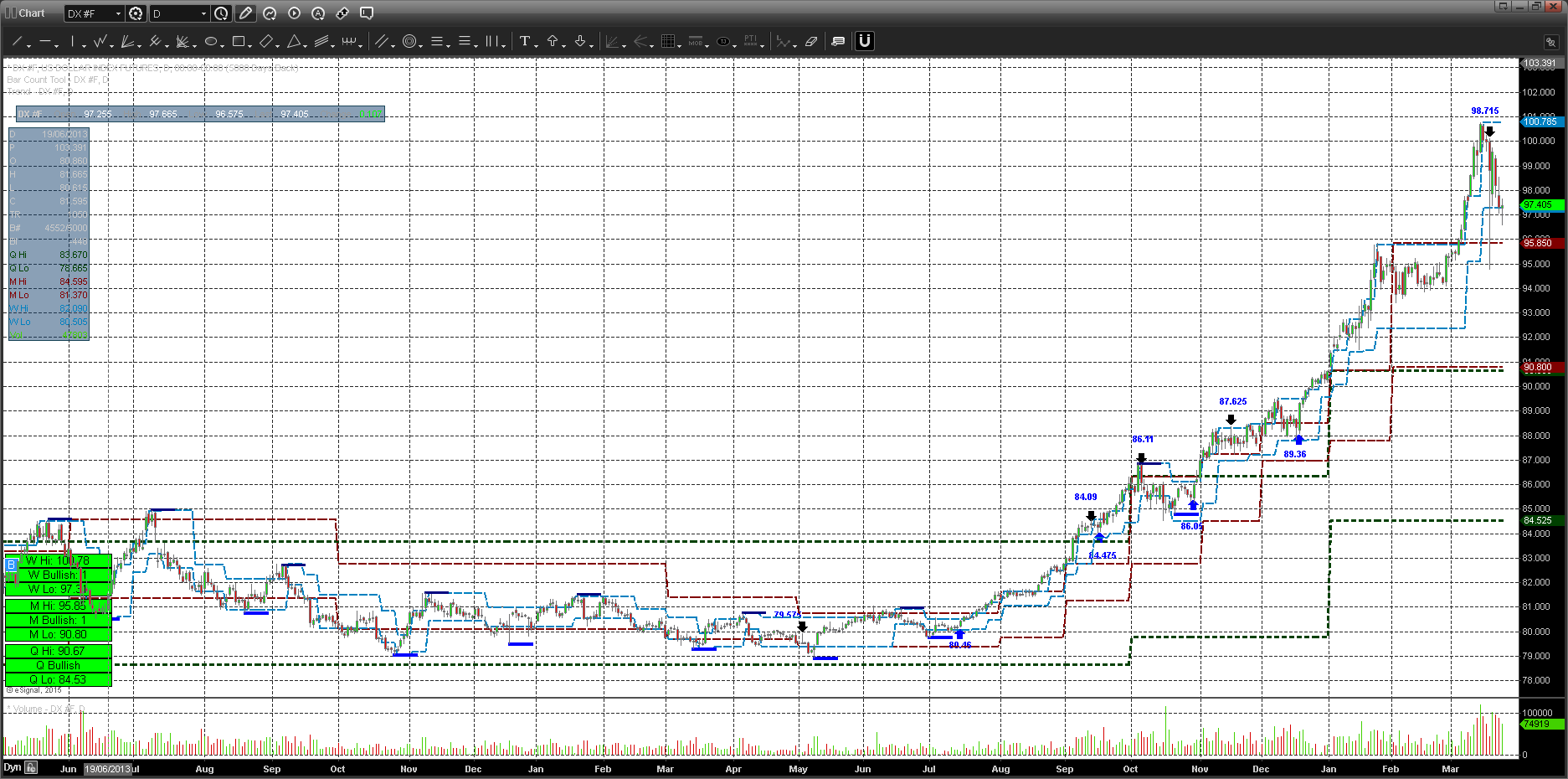 The system generated a buy alert for CHF (6S Globex) on 3/18, FOMC day at 1.0166, and the trade is running away to the upside. The Swiss Franc retraced the entire bar that took the overnight market from .97 to 1.22 level. The program picked off a huge winner on the retrace from 1.1549 – 1.0166 ($17,287.5/contract profit). This was 3x avg historical win rate. We could easily see a fast move to 1.0688 Quarterly High level (Green dashed line) and above that there is space on the chart for a bigger move. More importantly, this trade reflects an intermediate pivot in the Dollar Index (DX). I could see the Swiss move to 1.07 in line with a down move in the Dollar Index to the 95 level. From there, the question is whether we see a hard, fast correction in the Dollar, with a subsequent recovery, or whether this latest signal (CHF + DX) is the early stages of a more protracted Dollar correction, reflationary signal to the commodity space, as per the breadth of money flow into commodities since latest FOMC.