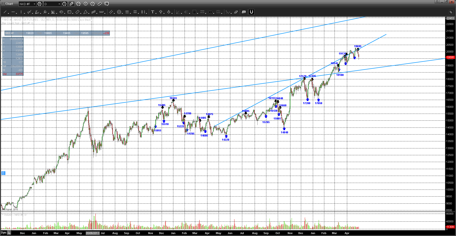 Equities are looking vulnerable as they push along at all time highs, across the board. The Nikkei Futures (NKD M5) delivered a short entry pre-FOMC 4/29 (yesterday). There was no spark-infusion to the equity space post-FOMC, so I entered the order at 19,800. See the chart attached below. All short signals across the equity space have been getting smoked over the course of the more recent (2-3 months) uptrend. I’m watching the DAX closely, as the leading international market, and its looking toppy here. On 4/27, the DAX triggered a nice long entry signal in the program, but the risk/reward was about even on the trade at the 12,000 level as per the front month futures. I waited on it. 4/28, the DAX reversed completely inline with a fast break across the German Gov Fixed Income space across the curve (BUXL, BUND, BOBL) all got hammered. My thought process with the equities is to look for weakness in the Euro-space/German markets, and leverage that weakness in the Nikkei 225 futures on short signals, which I’ve captured yesterday. Let’s see how this unfolds. My rule of thumb with trending market conditions (this has a specific, quantifiable definition) is to only trade in the direction of the trend, using my system, unless seasonal cycles and/or extent and duration of trend (#days/months in context with historical) all converge to support a countertrend exposure. Otherwise, its more favorable to either take some profit, or add to winners in trending environments on countertrend signals. Its also important to hone your market ‘sense’ or instincts and to develop yourself to know how to read the inter-market relations to selectively risk capital in countertrend context. I’ve stated my justification for a short Nikkei position here — using weakness in the DAX as a proxy for international markets, and stocks in general at this point.