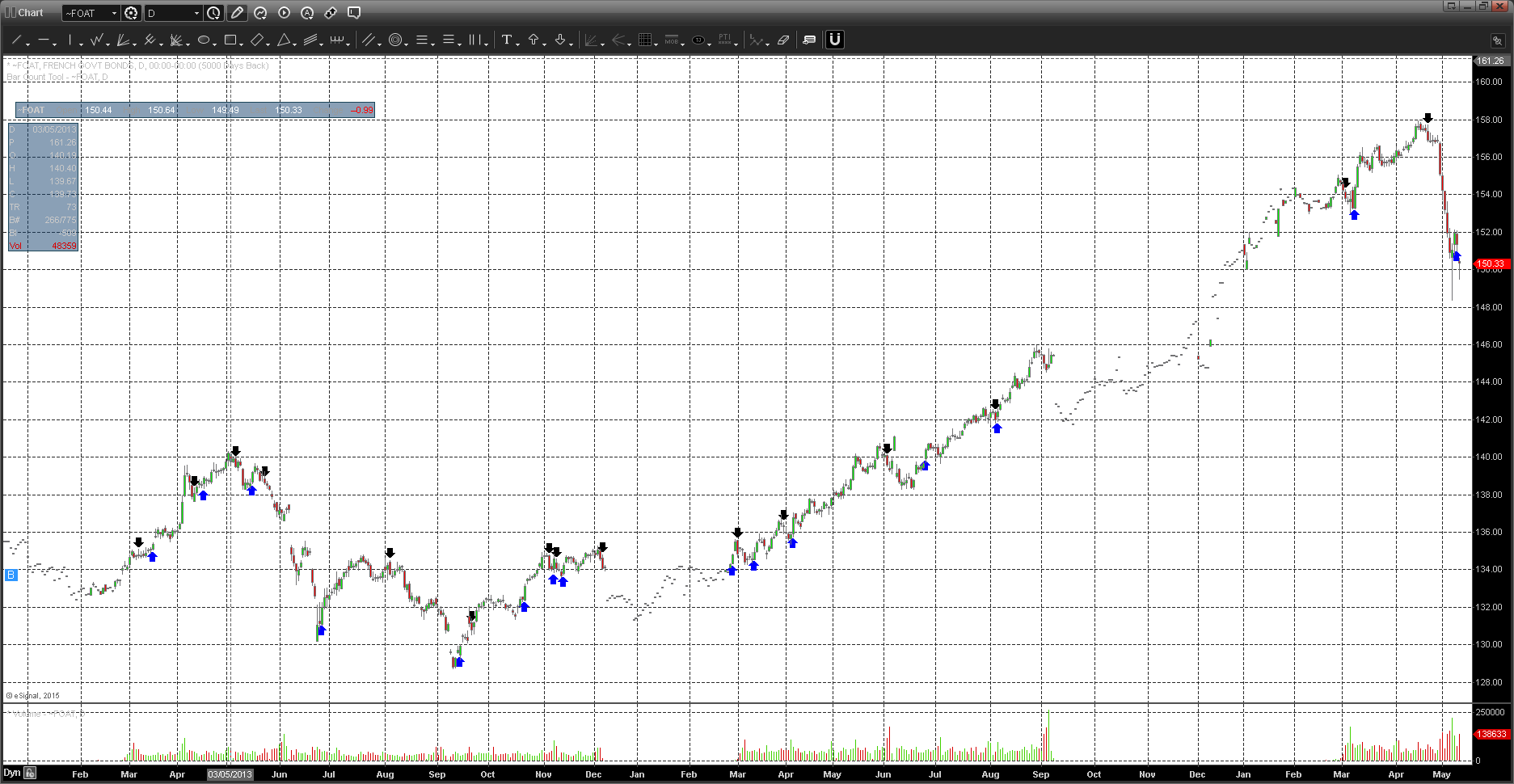 There appears to be reasonable odds of a short term price bottom in the Euro-Bond space (Long end). Using the systems primary trading vehicle, the French 30yr Government Bond (OAT), today’s session put in a ‘failure condition’, reconfirming the Long Signal entry May 8/15 off the long tailed low inflection point. The failure condition is a false +ve of a short signal that was reversed by the close of the trading day. This occurred today, as global debt markets came under overnight selling pressure, carrying into the open of the US markets. This weakness produced a Short Entry condition in the FOAT. This was reversed, however, as the OAT M5 rallied back (along with the FI space globally) and closed in a position where the momentum filter recognized the statistical nature of the activity as ‘meaningful’, relative to the short term proprietary structure that is used to benchmark and filter price activity intraday. When the French 30yr generates a ‘failed condition’ (a statistical re-affirmation of the prevailing signal, in this case long) there is a 100% win rate over 3 years of data. To boot, French Long Bonds trade summary in the program is as follows (1 lot, ex-slippage, commission)