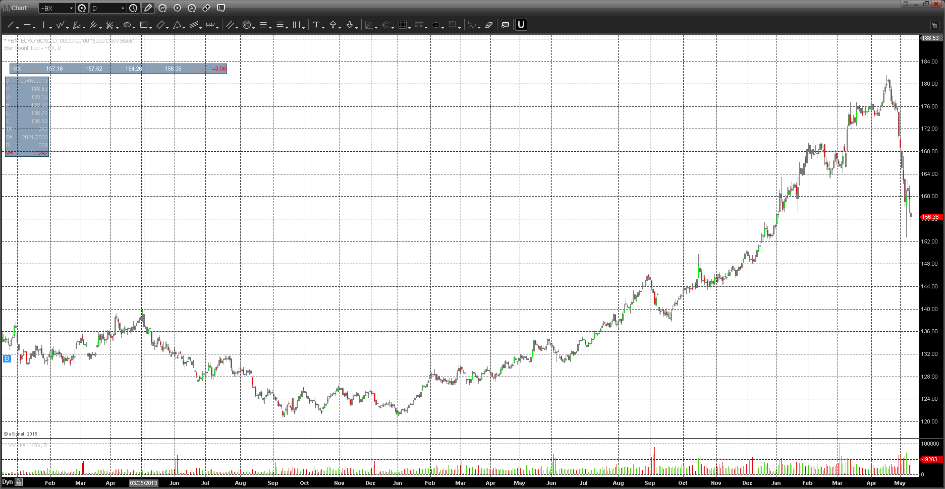 We can view the previous ‘Short’ Signal as per the more recent ‘black’ down arrow at the top of the chart, 158 level. With an exit at the corresponding ‘blue’ up arrow at the 152.02 level (6points/profit = 6000/contract). Euro-zone gov debt ‘crashed’ across the board at the long end, in line with Long term US treasury price. See the German Buxl (30yr bond price below):