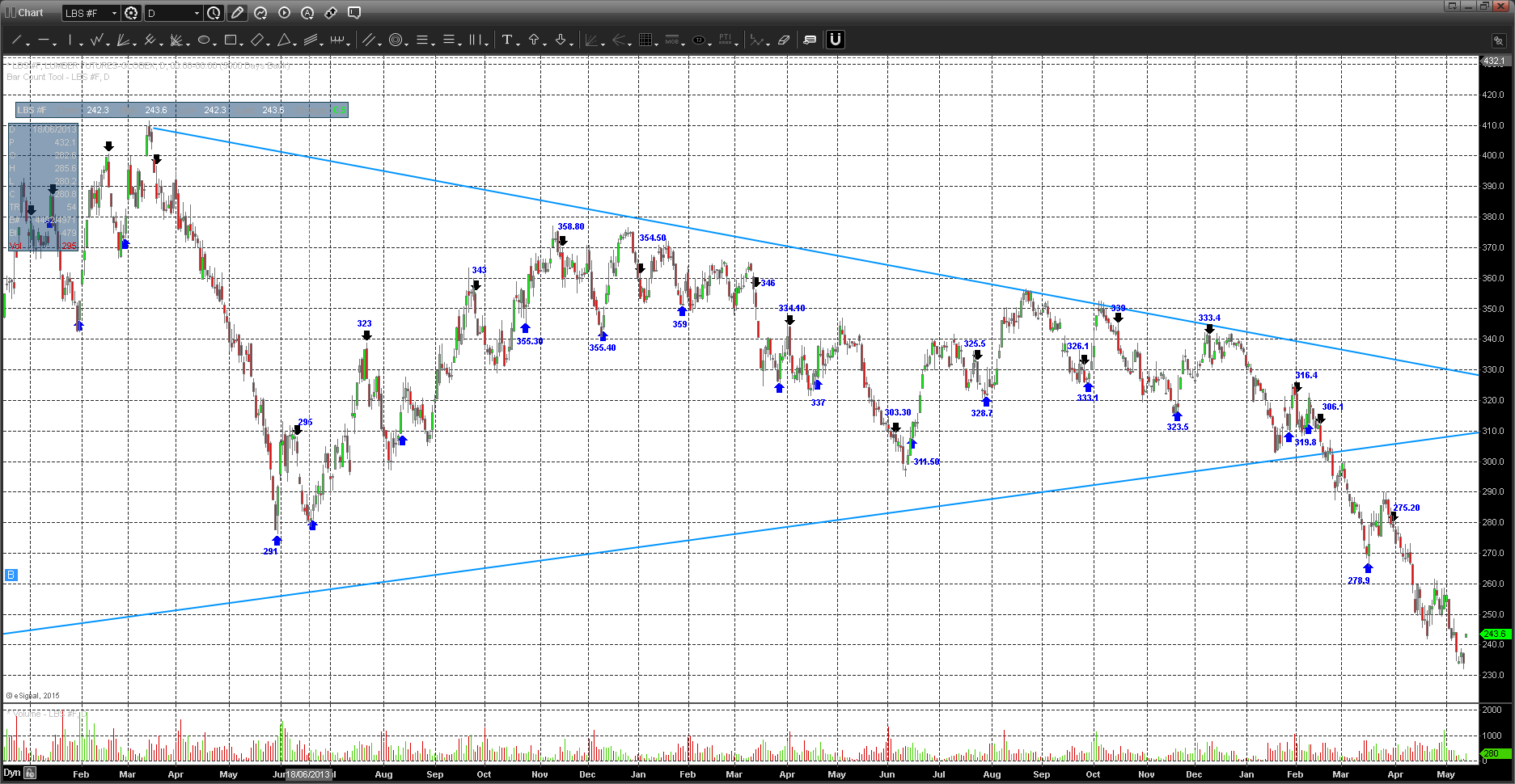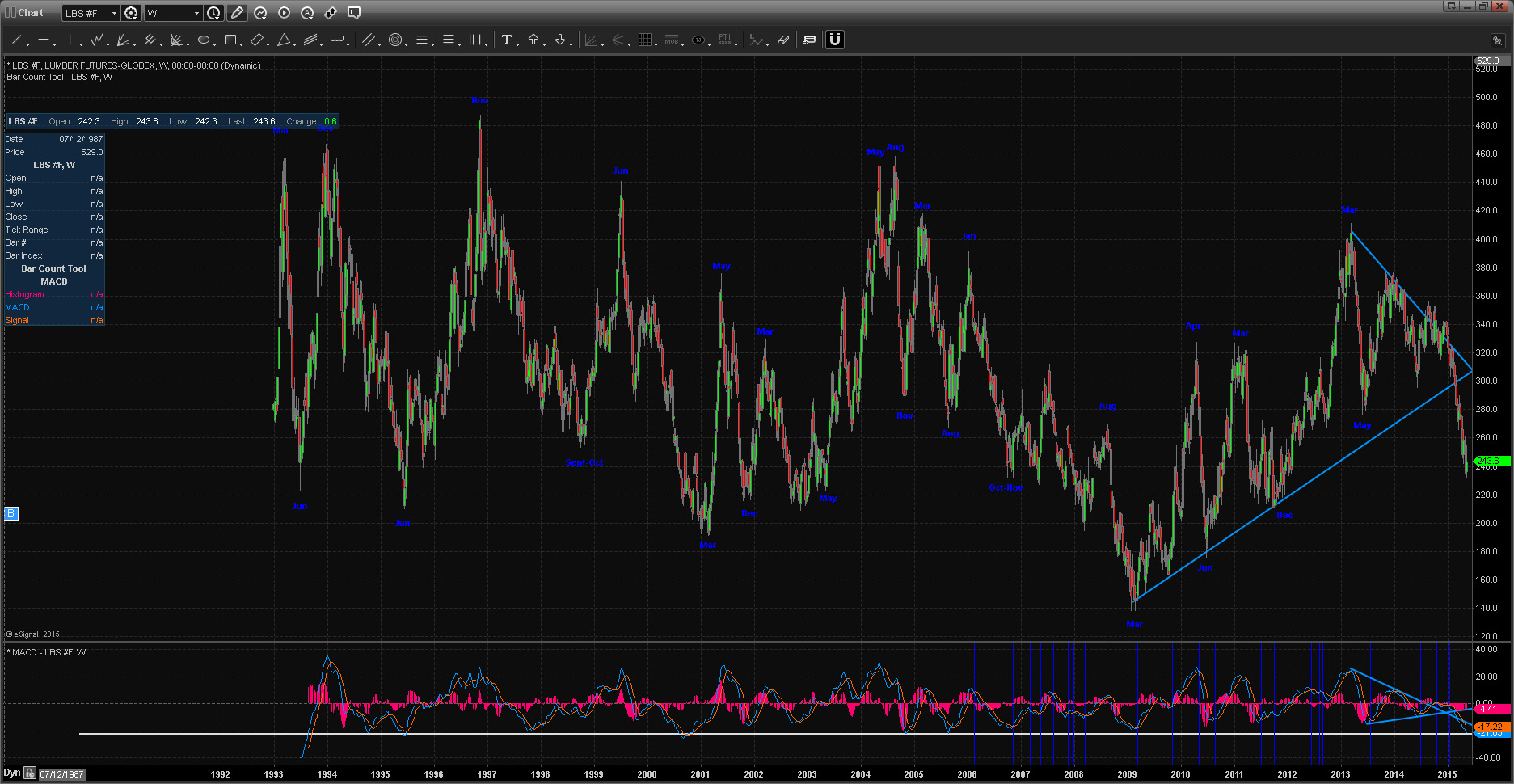 Short Entry in Lumber came 3/31/15 at 275.20. Lumber continues to be a weak-link in the ‘soft’ space, as per the major breakdown at the 272 level — representing quarterly structural lows, defined as a supportive level in this continuous contract since May 13′ pivot low. This market is currently trading in line with Jan 12′ levels. I’ve attached the weekly chart of Lumber below; I’ve included the weekly MACD in the lower panel, which addresses the over-sold nature of this market, given the momentum weakness to the 1st standard deviation, as per the ‘white’ horizontal line overlaying MACD data (< -21). This depressed, oversold level in momentum has only occurred 7 times since 93′: 3 of 6 (excluding this latest MACD read) reads on the ‘slow’ MACD have produced 50-100% rallies over the ensuing 6-12 months, whereas the other 50% of occurrences resulted in a further 3-12 months of perpetual weakness/basing, followed by 75-100% moves thereafter. If I were a long term investor looking at Commodities, Lumber is an example of having strong odds of being much higher in 12-18 months from now. The other possibility that we should be open too, is the fact that Lumber may be sending an ominous message to the equity/housing space, as per its deflationary action. This can be gleaned by the fact that Lumber lead the housing market by 2yrs (2006) and the broad equity market by 3 yrs (2007), when it made its final high in Aug 2004. By July of 2007, Lumber had already declined by -33% (460 in Aug 2004 to 306 in July 2006), prior to its final low inline with the broader market in Feb 2009 at 140. To date, Lumber has declined from the 410 level in Mar 2013 (410-243 = -40%) over 2 years. There have been 4 bear markets in Lumber since 93′: 3 occurrences with duration of 2 yrs (93′-95′, 96′-98, 99′-01′) and 1 duration of ~5yrs (04′-09′). From a timing perspective, Lumber is in the zone of putting in a final low, making this price level a good long term buying opportunity, or we have some further downside. I’m not a discretionary market-timer, and I just try to read the bread crumbs — and stick to system trades.